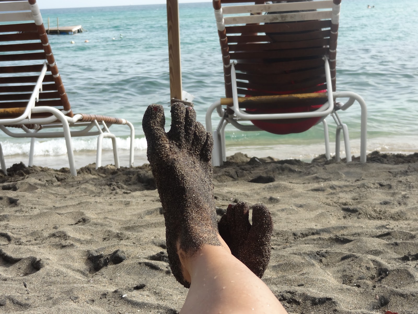 A black sand beach with rocks under the waves and way too many people trying to bully me into getting a massage.