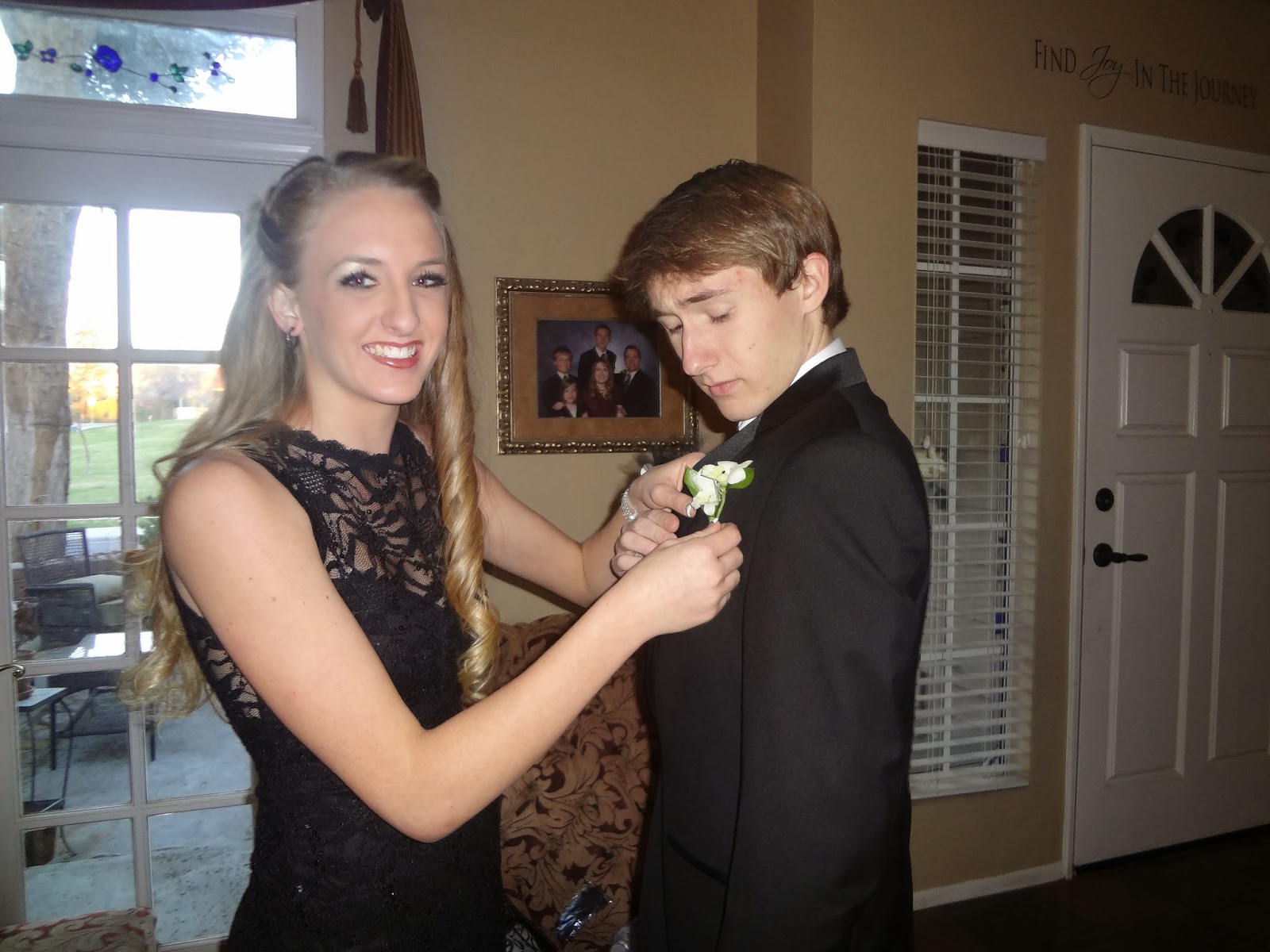 He had a date to go to Midwinter with Kelzie and friends. This was his first school dance that he's been to. Here they are putting on their flowers...